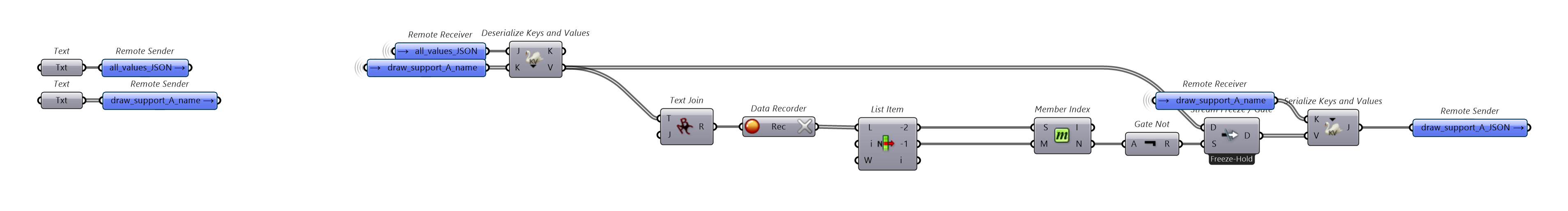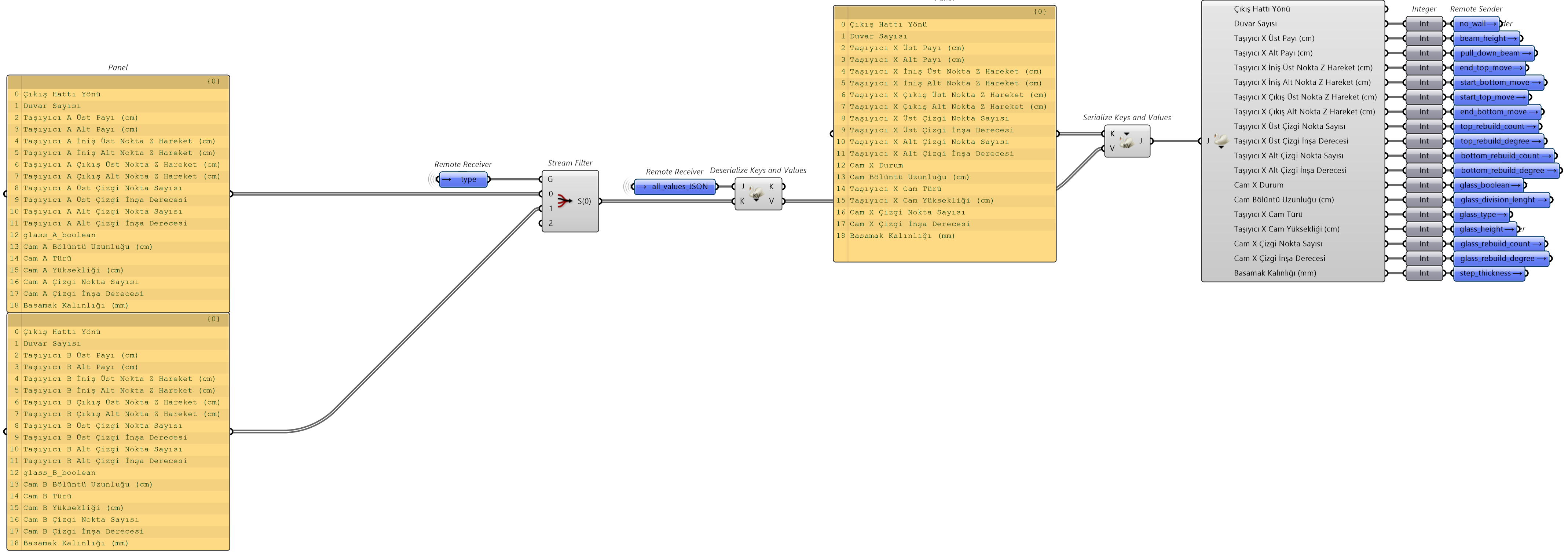 There are more than 100 different inputs that might be used or not and connecting them one by one to Hops components would be impractical. Therefore, a custom data management system was developed to handle this complexity efficiently. Data from each expander is collected and serialized with the names all values are merged and then data is seperated for each Hops component and deserialized in hops, resulting only needed data is sent to each Hops component.